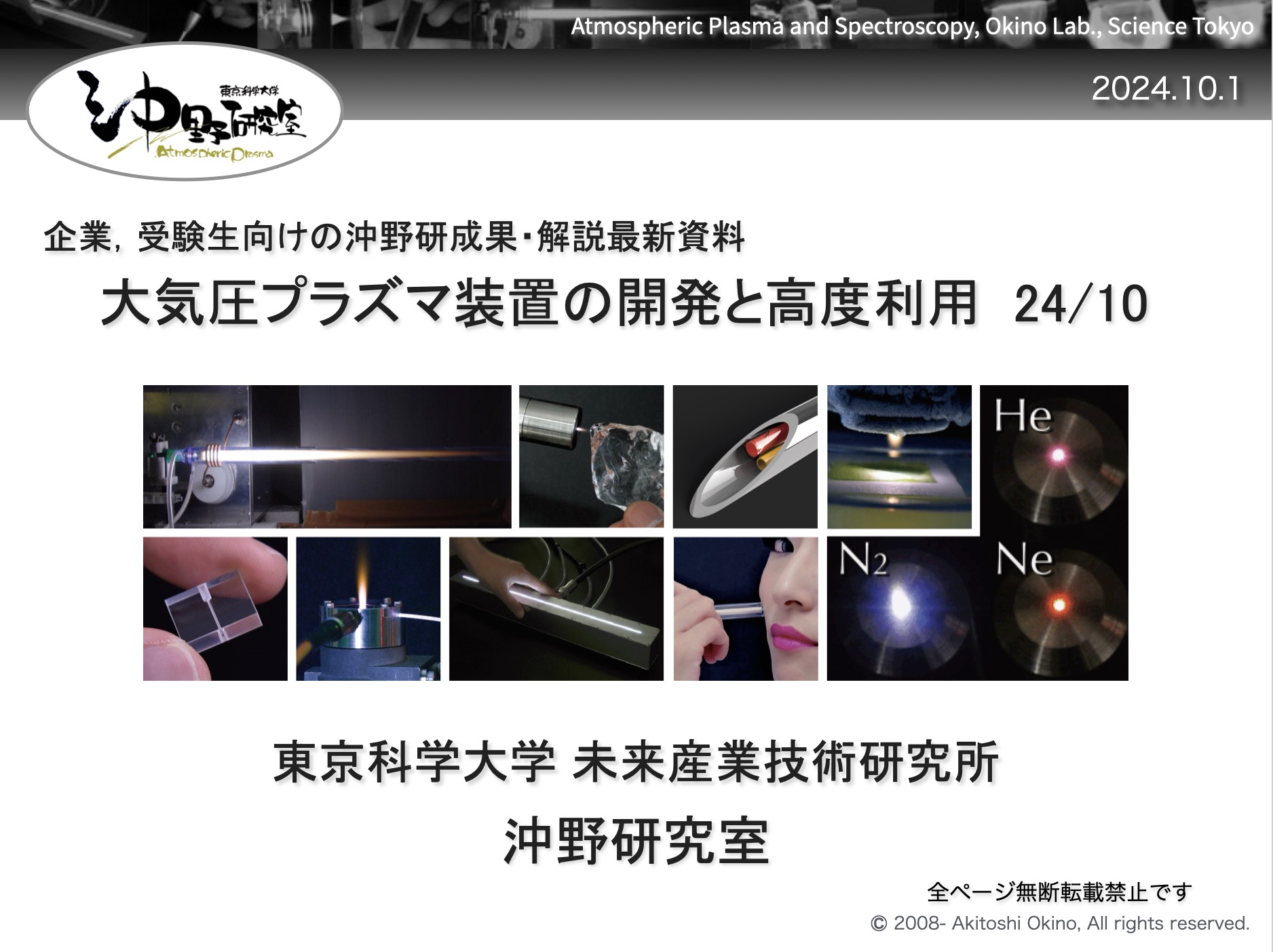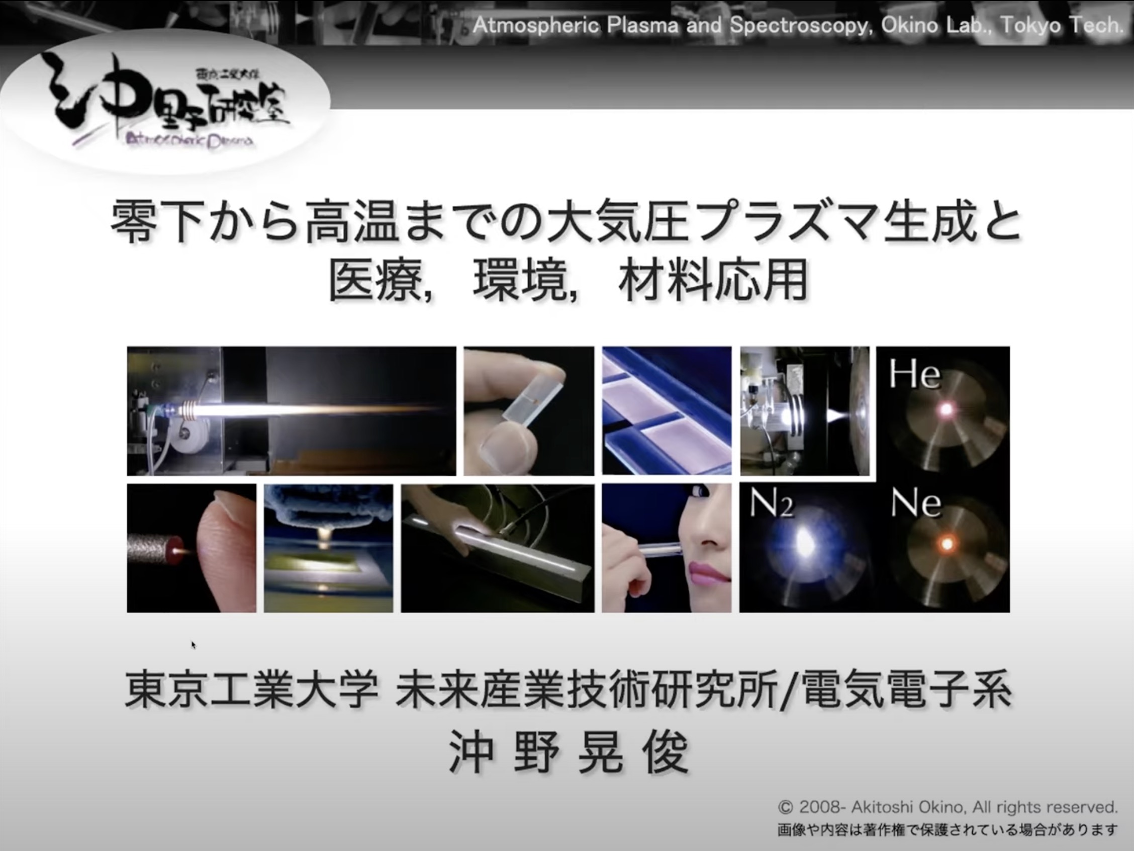 東京科学大学(旧東京工業大学)沖野研究室では,零下から数1,000℃,100ミクロンから1メートルまでの新しい大気圧プラズマ装置を設計・開発し,基礎的な評価と解析を行うとともに,その可能性を検証して広げるべく,医学,歯学,分析,生命,材料,環境,エネルギーなどの様々な分野に応用する研究を行っています。
